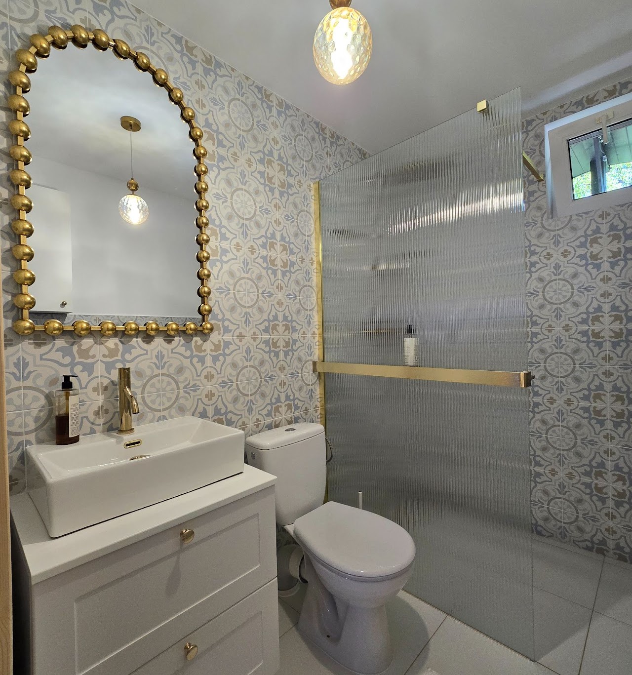 W domku znajduje się jedna łazienka z prysznicem, toaletą, umywalką i dużym lustrem.
